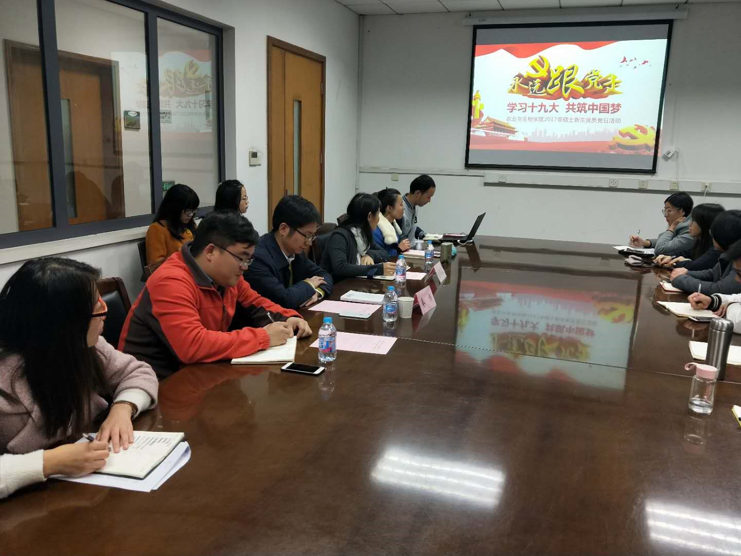 为深入贯彻学习党的十九大精神和习近平总书记新时代中国特色社会主义思想,11月24日晚,农业与生物学院全体2017级硕士新生党员在学院3-101会议室进行了“学习十九大 共筑中国梦”贯彻学习党的十九大精神专题党日活动。校团委副书记兼创业学院院长助理姜伟,院人才培养办公室副主任金丽鑫,院团学工作负责人冯沸出席会议。会议由2017级硕士第一党支部书记孙亚庆主持。