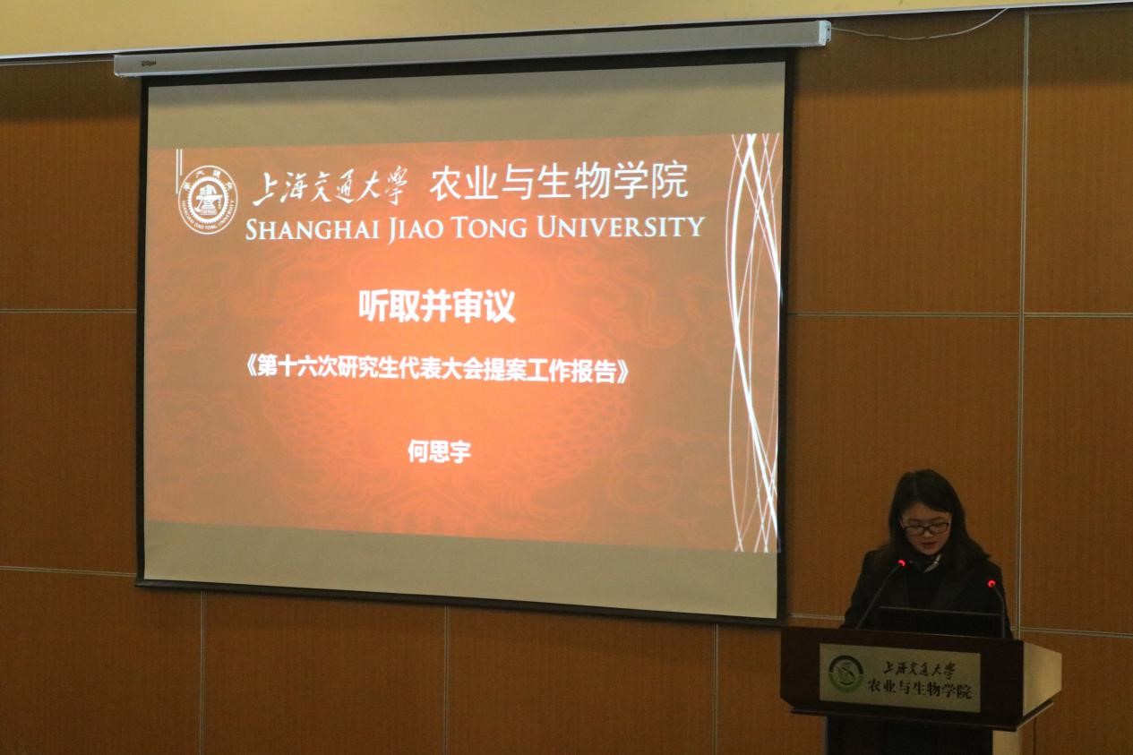 大会听取并审议通过了《农业与生物学院第十六次研究生代表大会筹备工作报告》、《农业与生物学院第十五届研究生会工作报告》及《农业与生物学院第十六次研究生代表大会提案工作报告》。