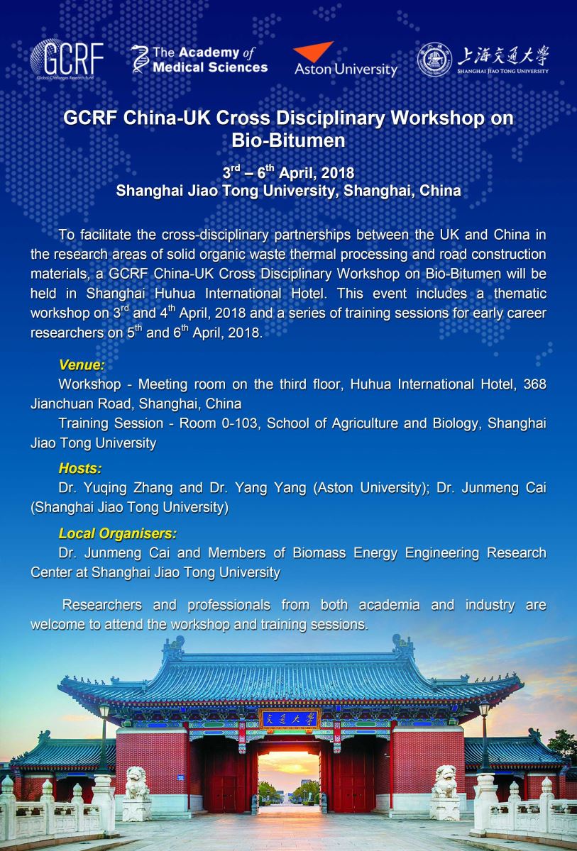 Dr. Yuqing Zhang of Aston Institute of Materials Research at Aston University (UK) and Dr. Junmeng Cai of School of Agriculture and Biology at Shanghai Jiao Tong University were awarded a UK Global Challenges Research Fund (GCRF) Networking Grant with a project entitled “Pyrolysis of Municipal Organic Waste for Renewable Road Construction Materials”. The purpose of this networking grant is to facilitate cross-disciplinary partnerships between the UK and China in the research areas of developing sustainable road construction materials from organic solid waste.