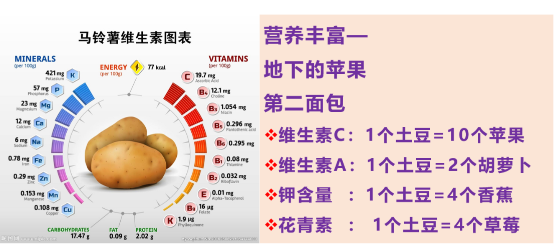 马铃薯俗称“洋山芋、山药蛋”等,在欧洲,马铃薯一直作为主粮消费,素有“第二面包”的美称。联合国粮农组织也早已将其列为世界第四大粮食作物,并有营养学家将其美称为“地下苹果”。马铃薯营养组成丰富,富含人体必需的碳水化合物、蛋白质、维生素、膳食纤维等全部七大类营养物质,且富含膳食纤维、花青素、钾元素等物质。与传统三大主粮相比,马铃薯作为主粮有其独特的优势:具有低热量、低脂肪的特点,且食用后饱腹感强,因此具有减肥的功效;含有大量膳食纤维,能使机体加快代谢,防止便秘;花青素含量高,具有抗癌功能;富含钾元素,具有降血压作用等。因此,马铃薯部分代替传统主粮可促进均衡营养和健康消费,已然成为我国人民第三次膳食营养结构升级不可忽视的一种重要农产品。