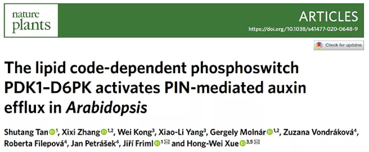 近日,Nature Plants在线发表了农业与生物学院薛红卫课题组与奥地利科学技术研究院Jiří Friml课题组合作研究成果“The lipid code-dependent phosphoswitch PDK1–D6PK activates PIN-mediated auxin efflux in Arabidopsis”。