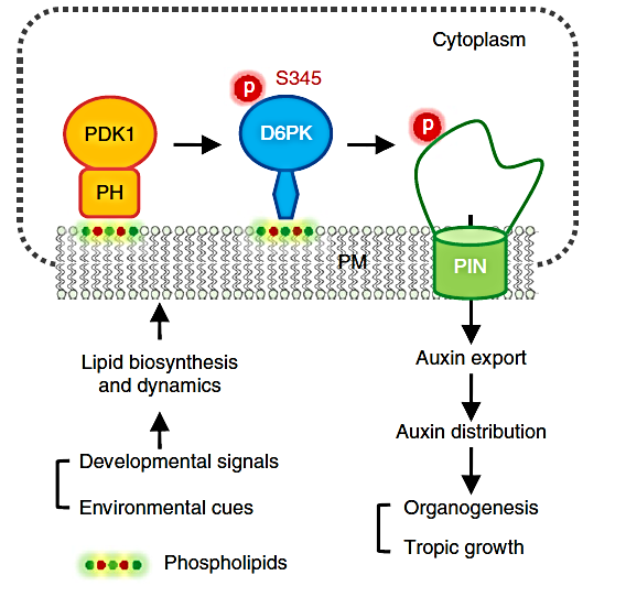 细胞学观察表明,PDK1.1和PDK1.2定位于细胞质和细胞膜上,在膜上呈现明显的极性分布。生化分析表明,PDK1.1和PDK1.2可以结合多种不同的磷脂分子,且这种结合对PDK1.1和PDK1.2的极性定位非常重要。遗传和生化分析表明,PDK1.1和PDK1.2可以直接磷酸化并激活D6PK蛋白激酶,D6PK进一步磷酸化并激活PIN蛋白介导生长素的极性运输,调控植物的生长发育过程。