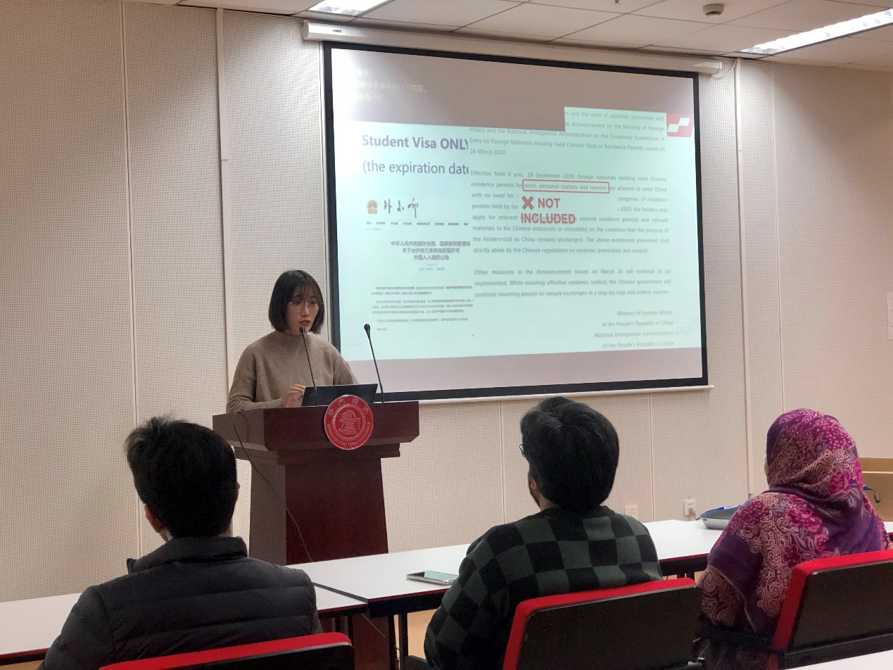 王丹向同学们说明境外留学生返校的条件以及介绍各项留学生的相关政策。