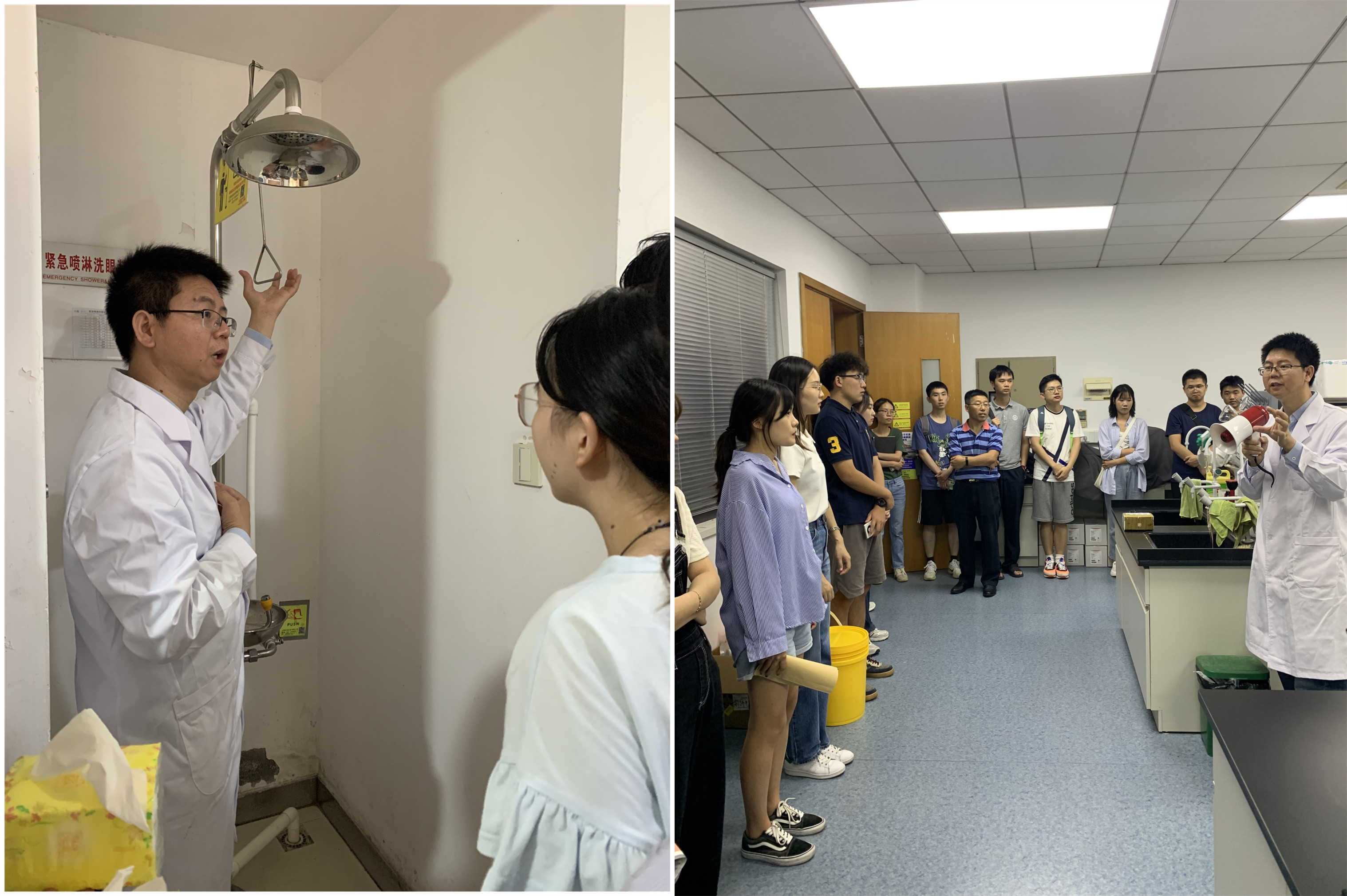 根据屈文军讲解应急冲淋和洗眼装置的正确使用方法和应注意事项,在场学生分小组进行了应急冲淋和洗眼装置使用演练,并进行交流和互动。