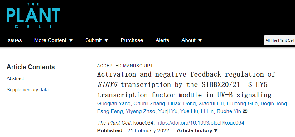 2022年2月21日,上海交通大学农业与生物学院尹若贺课题组在The Plant Cell杂志发表了题为“Activation and negative feedback regulation of SlHY5 transcription by the SlBBX20/21–SlHY5 transcription factor module in UV-B signaling”的研究论文,揭示了在紫外光UV-B的处理下,番茄转录因子模块BBX20/21-HY5激活HY5基因转录,而过量积累的HY5蛋白抑制自身基因转录,形成自身负反馈环,维持体内HY5的水平,调节番茄的光形态建成(Yang et al., 2022)。