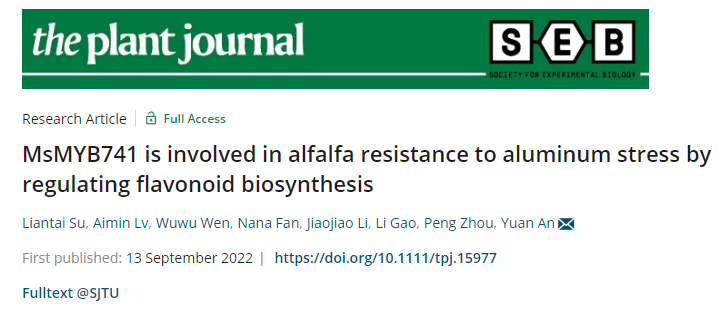 近日,上海交大农业与生物学院安渊教授团队在The Plant Journal在线发表了题为 MsMYB741 is involved in alfalfa resistance to aluminum stress by regulating flavonoid biosynthesis的研究论文,揭示了MYB转录因子MsMYB741正向调控紫花苜蓿类黄酮生物合成及提高苜蓿耐铝毒能力的作用机理。