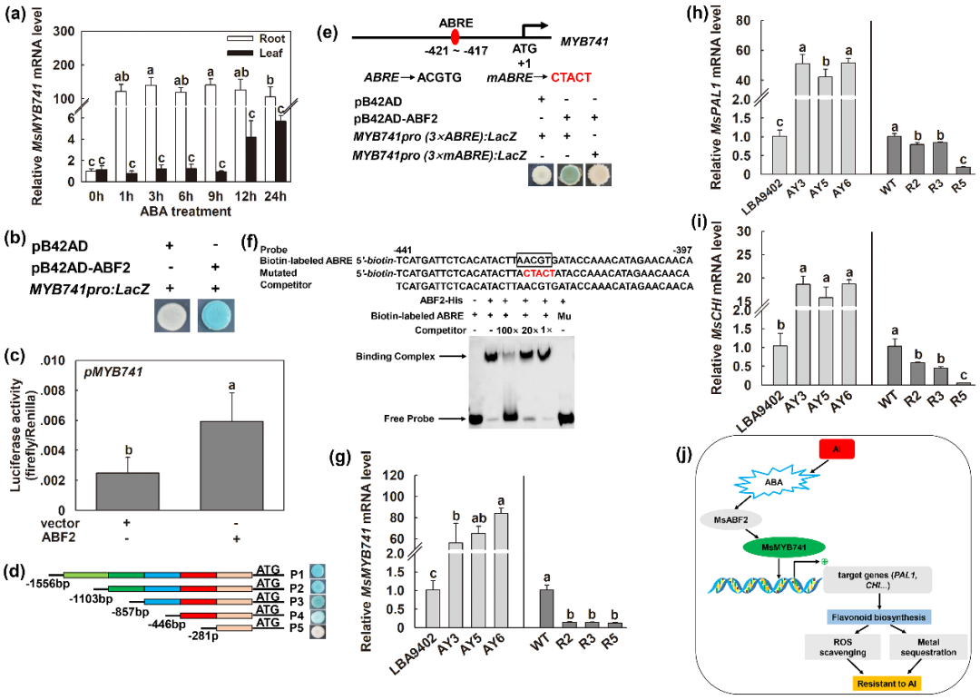 进一步研究表明,MsMYB741正调控MsPAL和MsCHI的表达,促进总黄酮积累,增加苜蓿根系黄酮分泌,降低过表达株系体内Al含量。此外,研究还发现,响应ABA信号的MsABF2蛋白是MsMYB741的上游调节因子,通过与MsMYB741启动子中ABRE元件结合正调控其表达,基于此,作者构建了ABA-MsABF2-MsMYB741-MsPAL/MsCHI 提高苜蓿耐铝毒能力的工作模型(图2)。