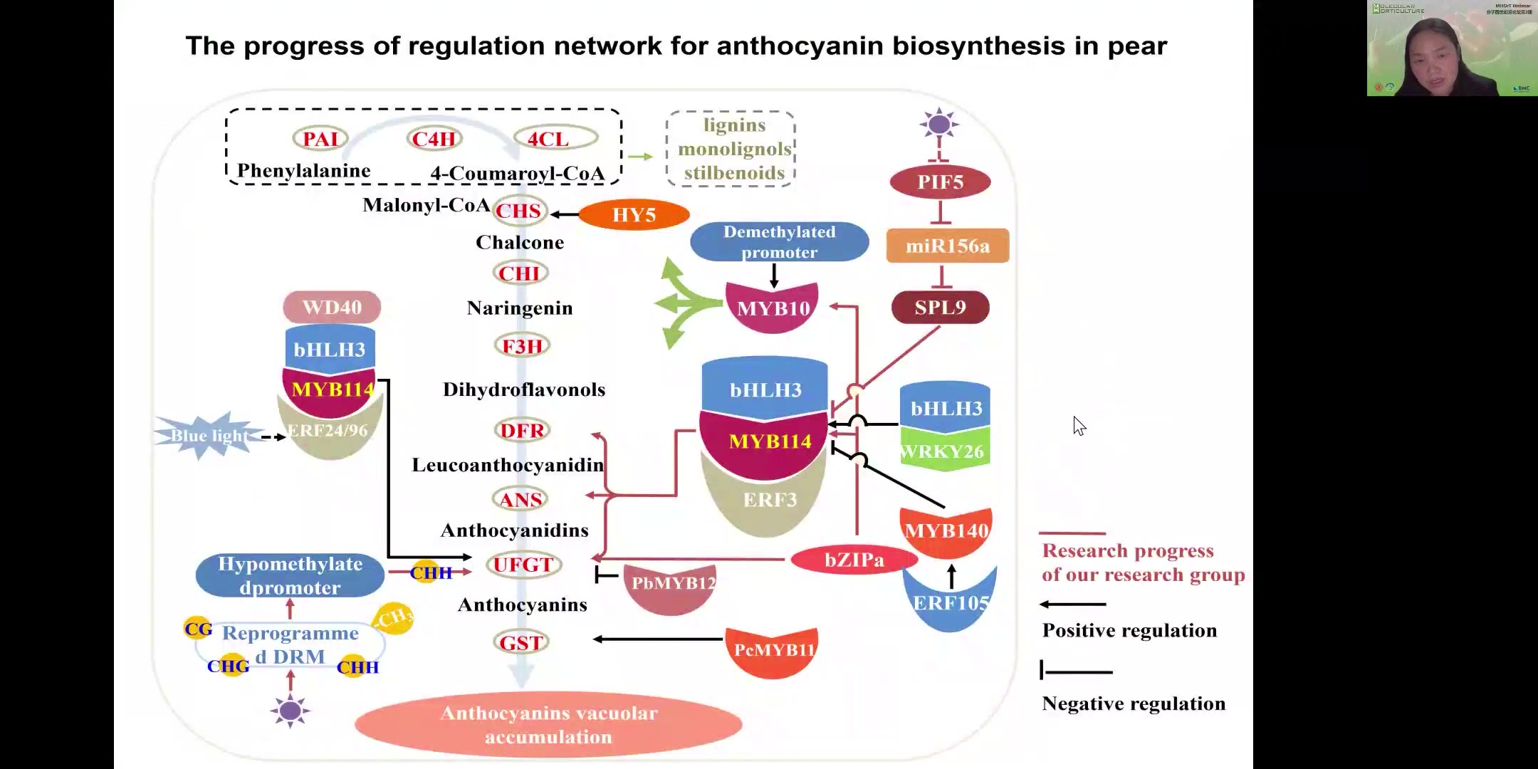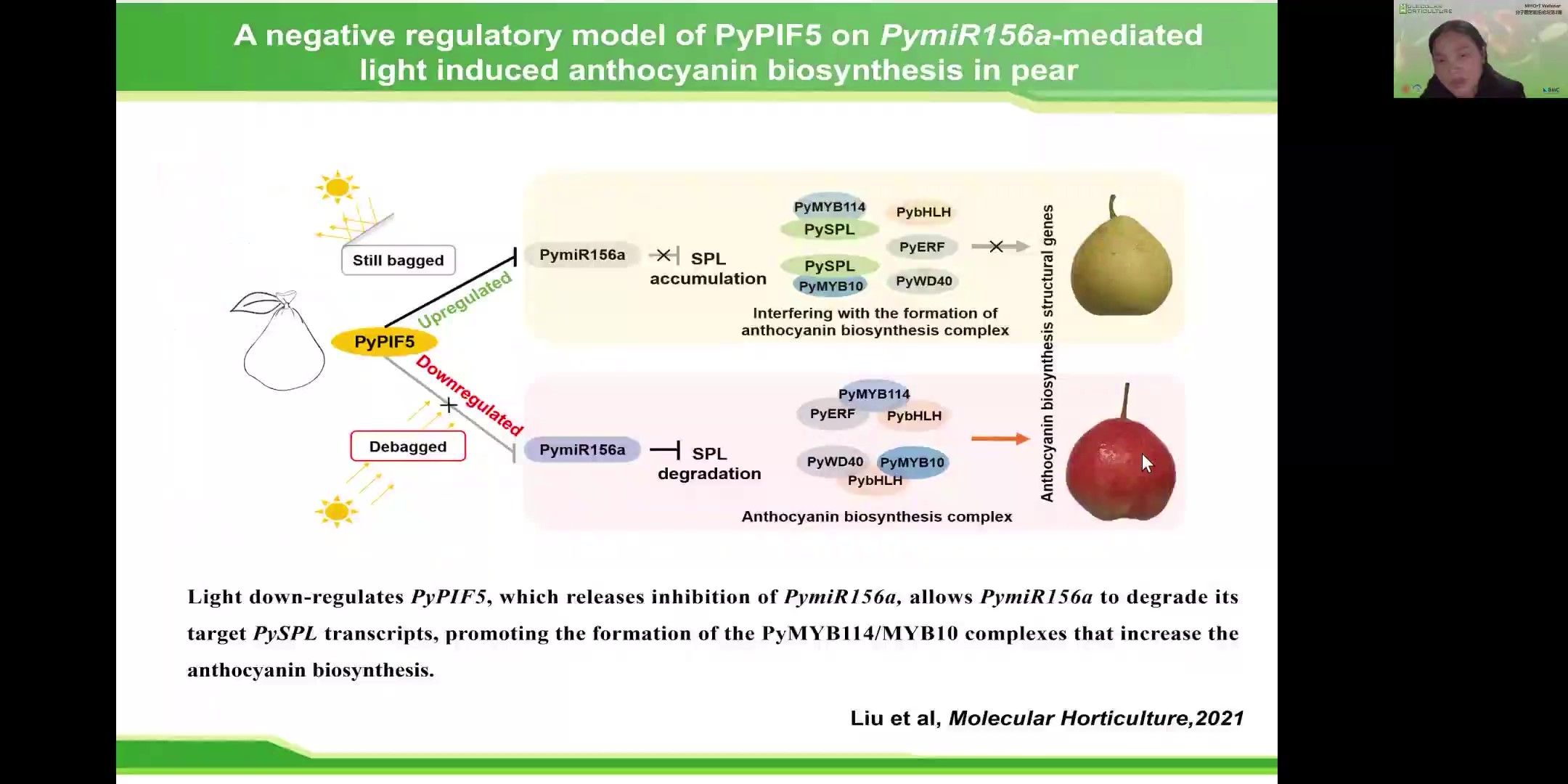 多数水果的色素沉着始于果实发育的中后期,色素分布受环境因子,尤其是光照的影响,进而容易出现果实着色不良或着色不稳定的问题。因此,阐明光诱导的梨着色分子机制是梨外观品质改良和着色调控技术创新的重要基础。吴俊教授团队通过转录组与代谢组结合的研究手段,阐明了PybZIPa-PyUFGT模块介导的红梨着色的光响应分子机制,以及光信号通过下调PyPIF5,解除其对PymiR156a的抑制作用,引起PymiR156a对靶标PySPL的降解,促进PyMYB114/MYB10复合物的形成,进而促进梨果皮中花青苷的生物合成和果皮着色。此外,甲基化水平对红梨中光信号诱导花青苷合成也有影响。