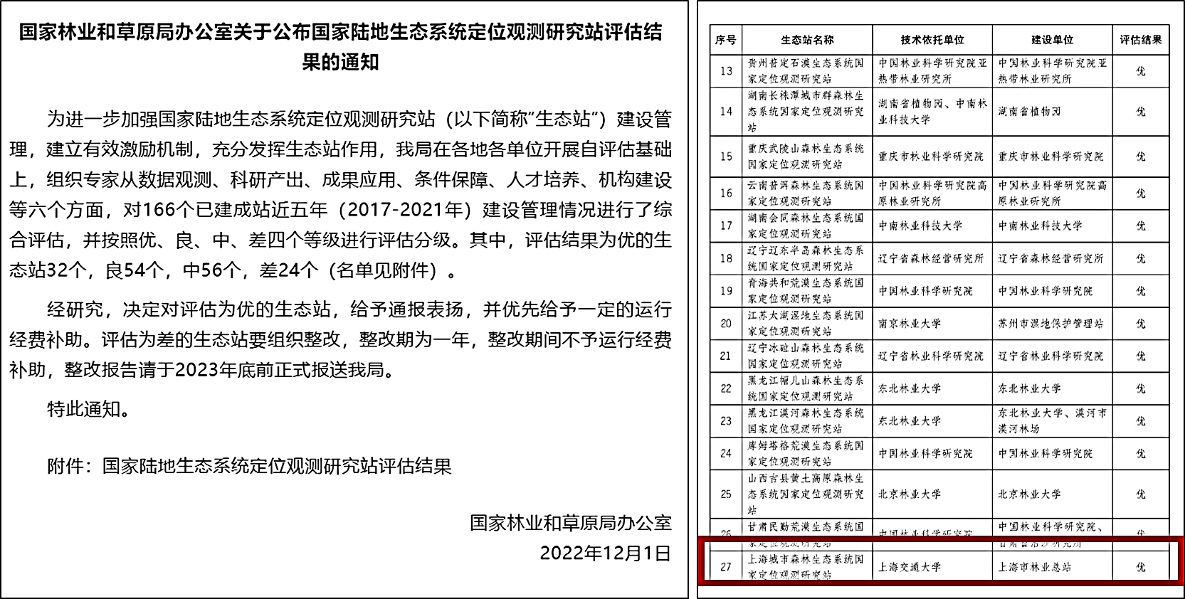 国家林草局近日公布了国家陆地生态系统定位观测研究站评估结果,由上海交通大学农业与生物学院作为技术依托单位的上海城市森林生态系统国家定位观测站获评优秀。