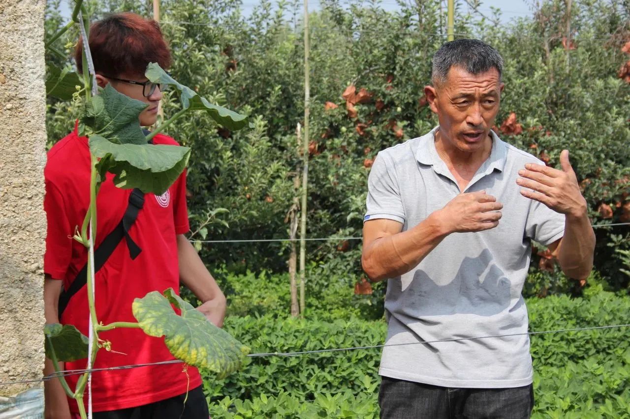 首先,实践团来到立农家庭农场参观产业,与农村一线工作者进行交流。农场内绿树成荫,硕果累累,各类果树科学布局,整齐排列。农场负责人详细地介绍农场的相关情况。据了解,目前农场种植了苹果、梨、葡萄、花生等多种经济作物。与传统种植方式不同,农场实行合作社制度,在品种、施肥、杀虫以及销售方面更具科学性和主动性。农场负责人表示,种植的苹果是经过嫁接后的新品种,依靠人工搭建的架子生长,不仅生长快速,品质上乘,而且其采摘成本和损耗大大降低。此外,农场采用自动灌溉机器对种植的果树进行灌溉,可根据作物生长的时期和外界温度科学选择灌溉时机和用水量,保持适宜生长环境,提升果树产量,扩大种植效益。