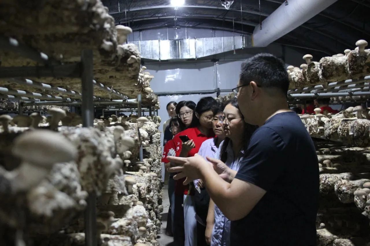 接着,实践团来到红泥崖村菌菇产业基地进行参观。一座座整齐划一的现代化标准种植大棚排列在田间。在香菇棚里,一排排食用菌棒错落有致。工人们正忙碌着分拣菌棒、采收菌菇,肥硕的香菇装满箩筐,准备外销。据悉,红泥崖村依托村党支部领办合作社,立足自身实际,以“支部引领、党员带头、村民参与”的方式发展食用菌产业,用小小蘑菇开辟了乡村振兴的致富路。目前,红泥崖村新建了14个食用菌大棚,全部被村内党员、群众抽签承包,预计每年可为村集体增收16万元。下一步,红泥崖村将发挥好典型引路作用,广泛招引合作企业,在村内建设菌棒厂项目,扩大产业链,把小蘑菇做成强村富民大产业。