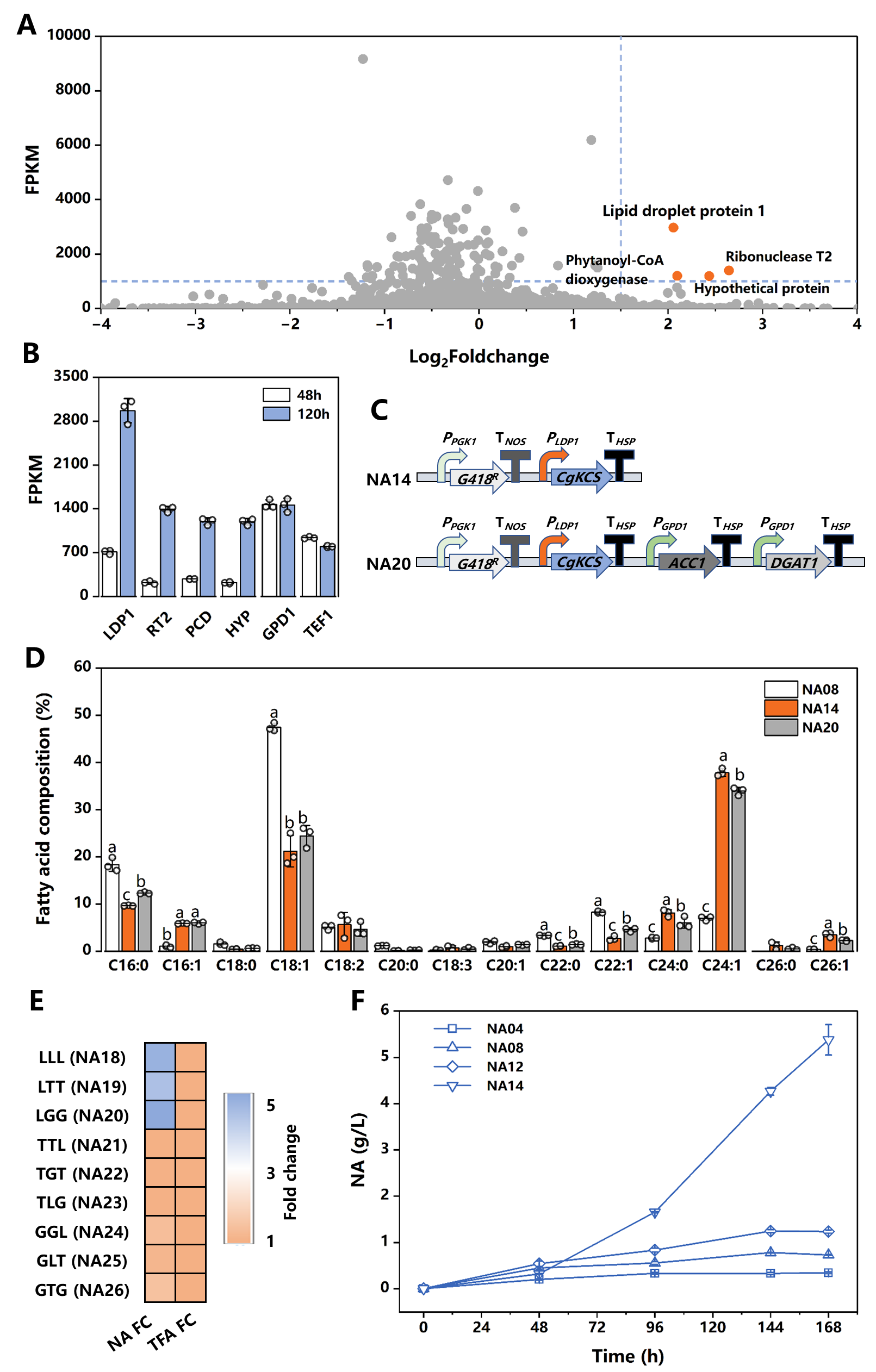 超长链不饱和脂肪酸在认知改善、大脑发育和脑部疾病治疗方面具有特定的生物学功能。2017年,植物源神经酸已经被我国卫健委批准为新食品原料(卫健康,2017年第7号文)。神经酸的获取目前主要来源于蒜头果、元宝枫和文冠果等经济林果。植物源神经酸生产存在气候依赖性强、培育难度大、占用耕地及生长周期长等问题,因此通过合成生物学与代谢工程技术改造产油酵母是实现功能性脂肪酸的商业化生产的有效途径之一,也是践行“大食物观”的必由之路。然而,工程化改造产油酵母合成超长链单不饱和脂肪酸的报道中,油脂积累期间往往不能有效实现C18到C24碳链延伸,限制了超长链单不饱和脂肪酸的合成。产油酵母合成大量脂肪酸通常受到严格的代谢调控,只有在菌体进入油脂积累阶段才会大量合成,因此如何有效重构油脂积累阶段的代谢网络是实现超长链单不饱和脂肪酸高效生物合成的瓶颈问题。