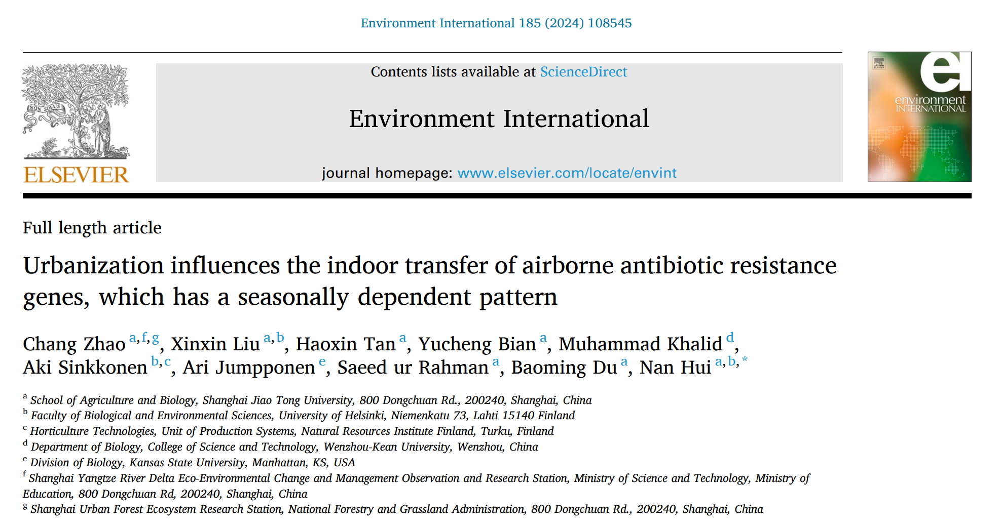 Environment international — 惠楠团队揭示城市化和季节对气溶胶抗生素抗性基因入室传播的影响机制