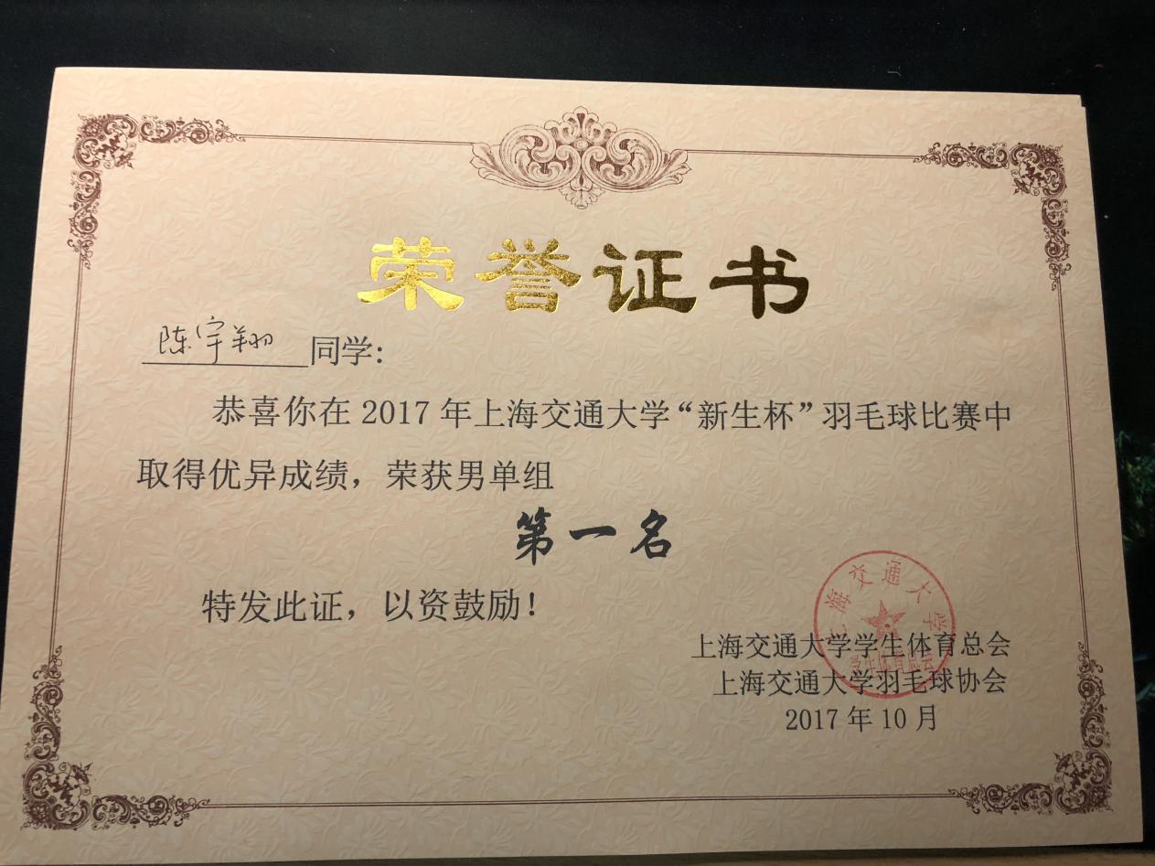 男单决赛中,陈宇翔对阵外国语学院的许泰哲。比赛一开始,许泰哲较早进入状态,保持领先,陈宇翔后来居上,充分发挥自己的优势,牢牢压制对手,令场面形势逆转。最终,陈宇翔以21:15先行拿下第一局。第二局比赛,陈宇翔掌握主动,将比分拉开,虽然对手一直艰苦追分,但可惜仍然没有逆转局面。第二局比赛仍以21:18告终。陈宇翔成功斩获“新生杯”男单冠军。
