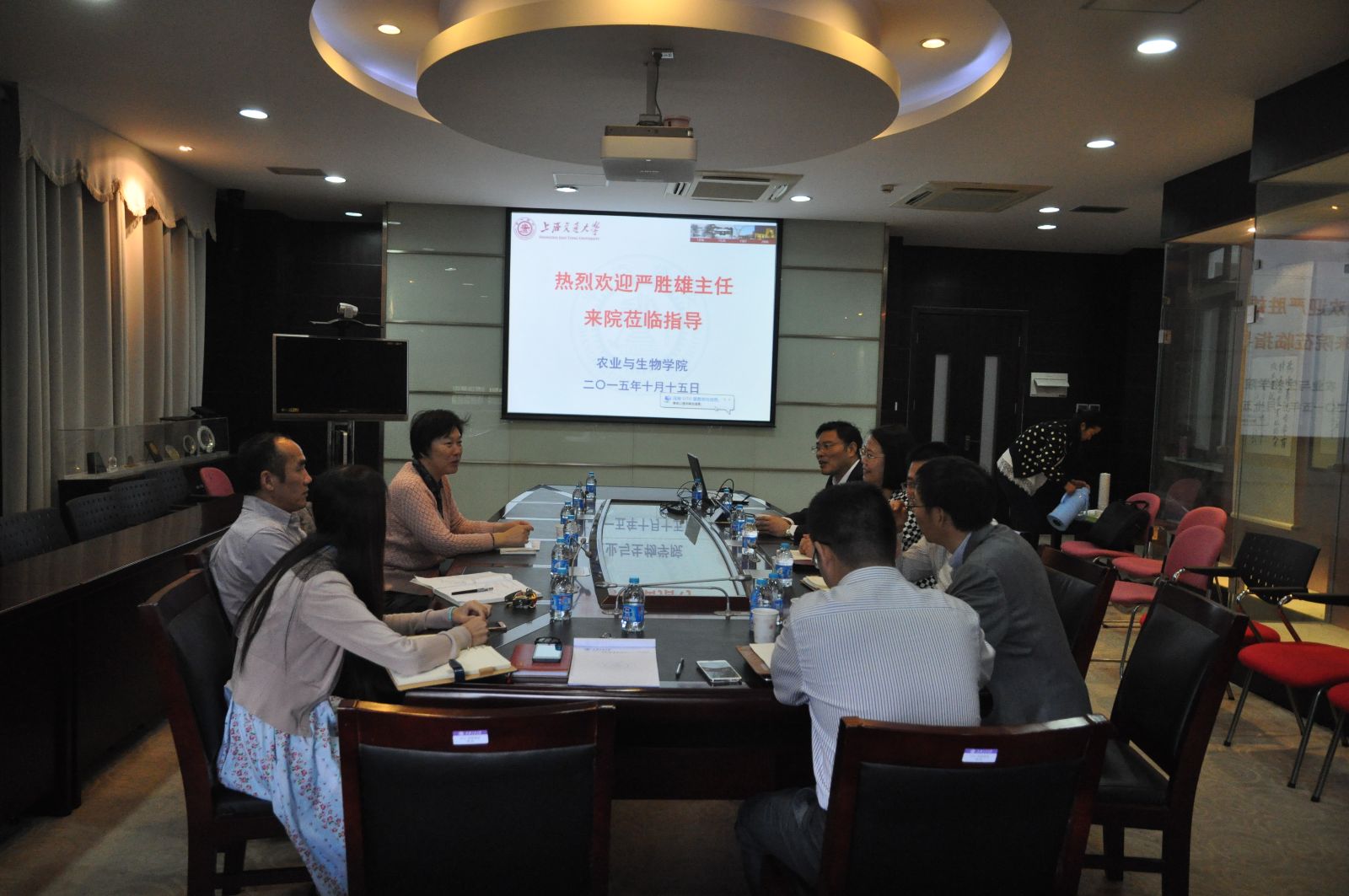 2015年10月15日,上海交大兼职研究员、上海市农委原副主任严胜雄莅临农生学院指导工作,农生学院院长周培、党委书记齐红、新农村发展研究院副院长曹林奎、学院副院长左开井、副院长陈功友及相关人员参加会议。