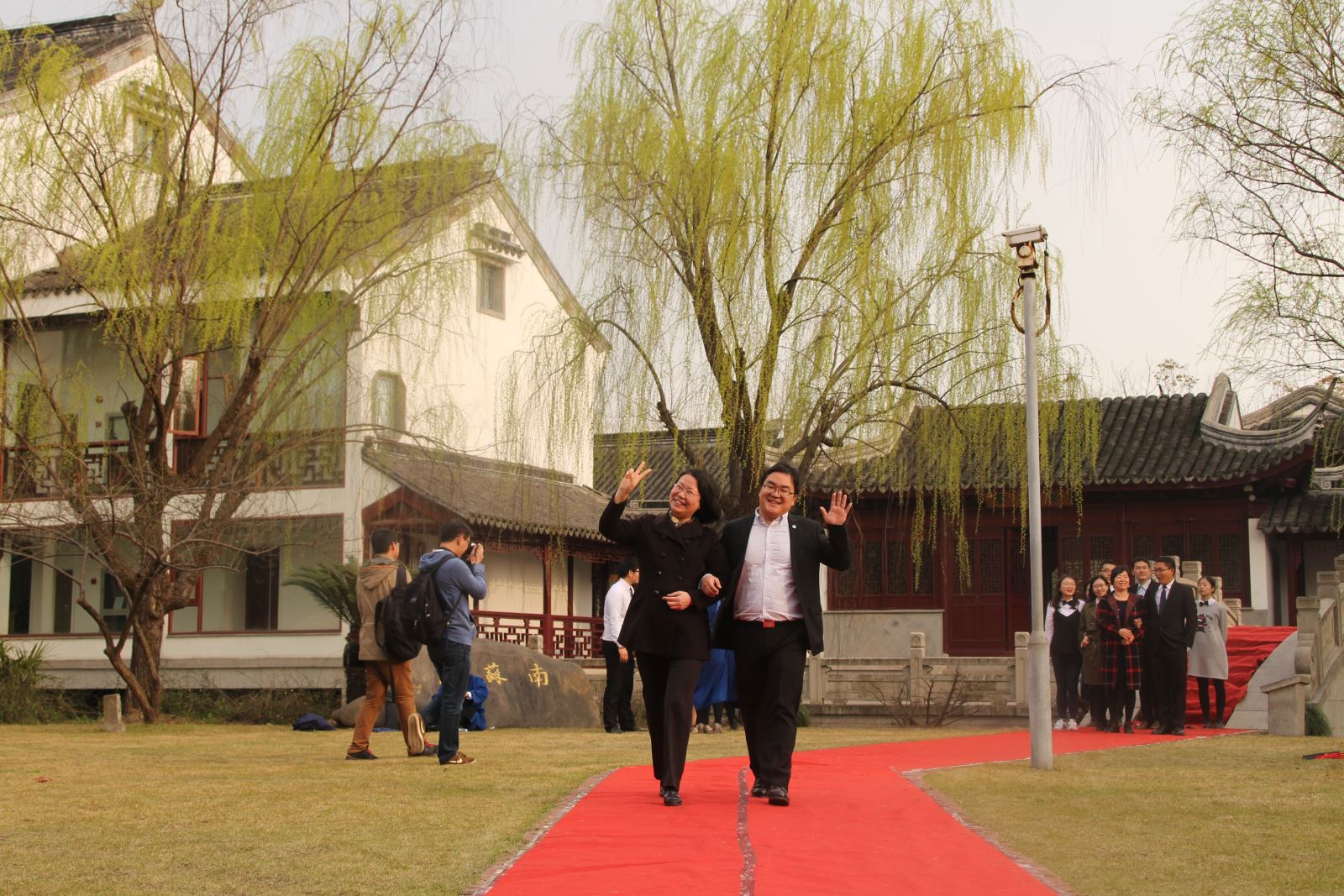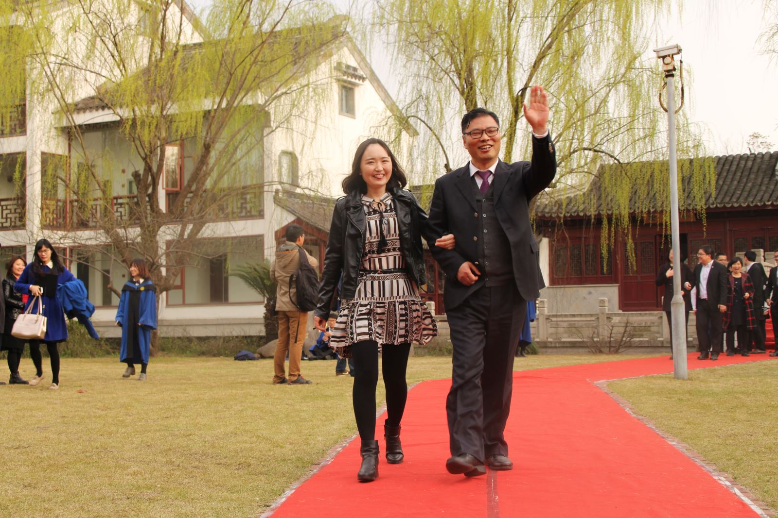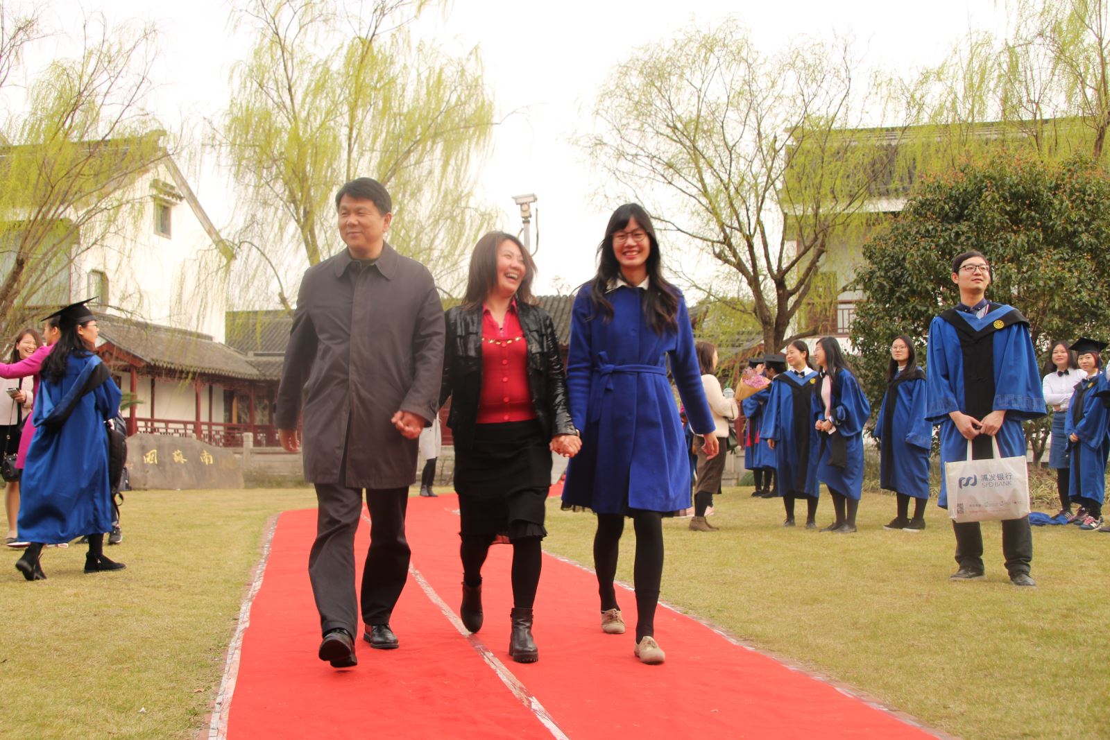 红毯仪式上,伴随着优美的曲调,同学们身着礼服,三三两两携手从留园拱桥处步上红毯,并在签名墙上签名留念。