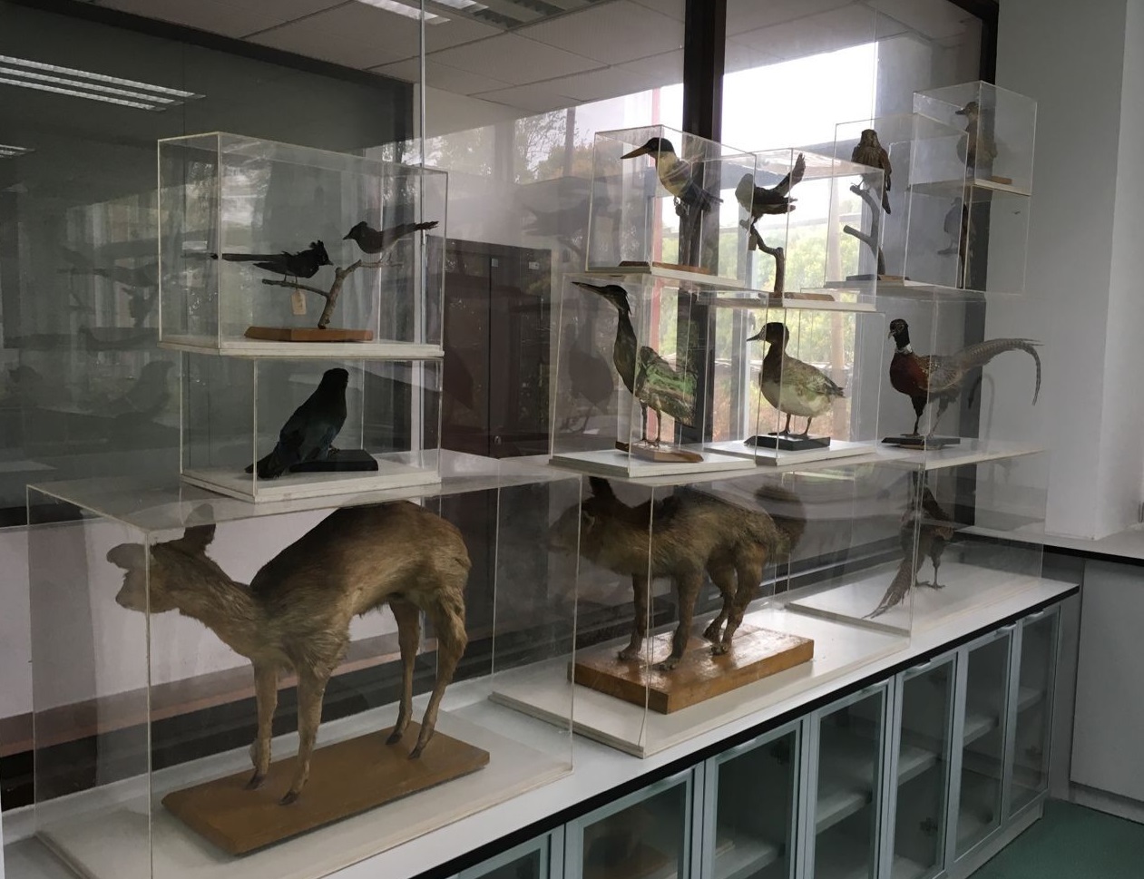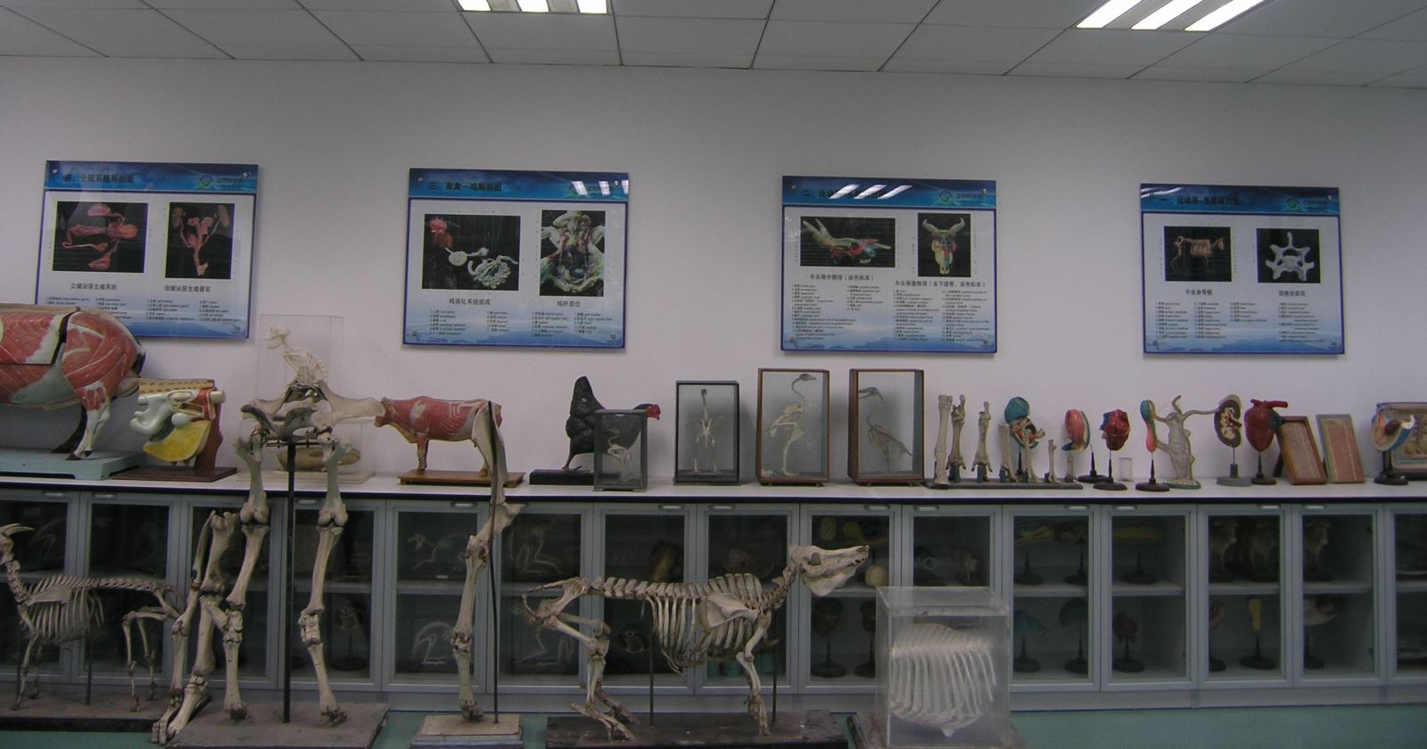 动物解剖标本室目前已经梳理布置了标本2000余件,包括家畜解剖学标本1500余件、鸟类和兽类标本400余件。现有标本保存形式有:浸泡、干壳、剥制标本等。所陈列的标本具有动物门类较完善、浸泡标本较多的特色和优势,包括国际一级濒危动物麂以及国家重点野生动物名录二级保护动物豺、穿山甲等。动物标本室毗邻教学实验室,可就近提供直观形象的课程教学教具,将理论讲解与标本观察有机地结合起来,极大丰富学生的直观理解力和感性认知力,提高教学与实验操作效果。