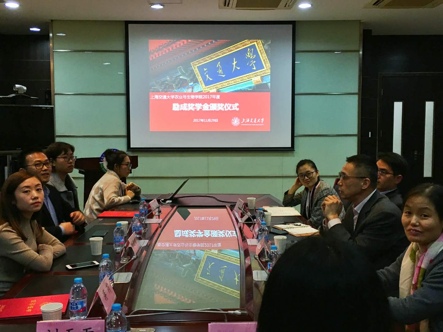 11月29日下午,上海交通大学农业与生物学院“2017年度励成奖学金”颁奖活动在学院0区102会议厅举行。学院党委副书记龚强、励成营养公司副总经理唐诗平、励成营养公司市场部经理郭晓艳、学院人才培养办副主任金丽鑫、学院团委书记卜君敏、乳品科学实验室教师张少辉出席了颁奖仪式。参加本次颁奖活动的还有食品科学与工程专业部分同学。活动由张少辉教授主持。