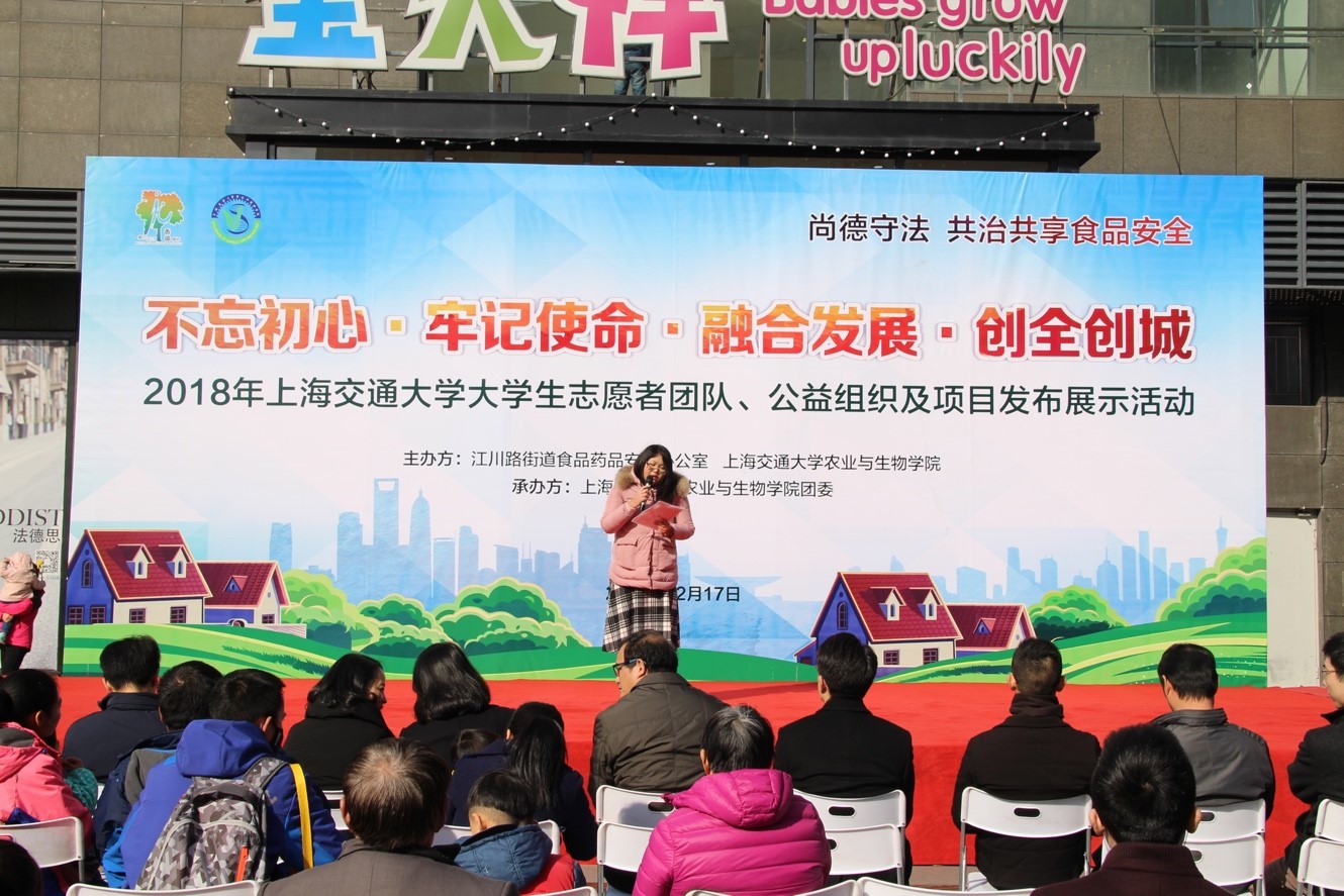 12月17日,农业与生物学院与江川路街道食品药品安全办公室在闵行区碧江生活广场联合举办2018年上海交通大学大学生志愿者团队、公益组织及项目发布展示活动。农业与生物学院党委书记齐红、党委副书记龚强、江川路街道办事处副主任王春美、校团委副书记姚晨及闵行区市场监督管理局、区食药安办、江川路街道食药安办、江川市场监督管理所相关领导及江川街道居委相关负责人等参加活动。
