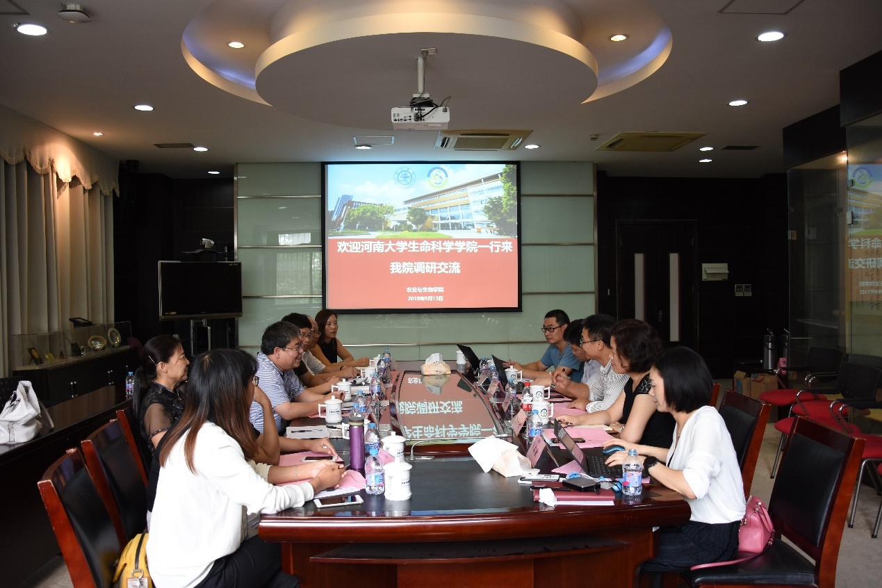 9月13日,河南大学生命科学学院副院长安国勇一行来农业与生物学院调研交流,在农生大楼0-102召开座谈交流会,学院副院长左开井,植科系主任张才喜、党支部书记张屹东,学院党政办、人才培养办相关老师参会,会议由左开井主持。