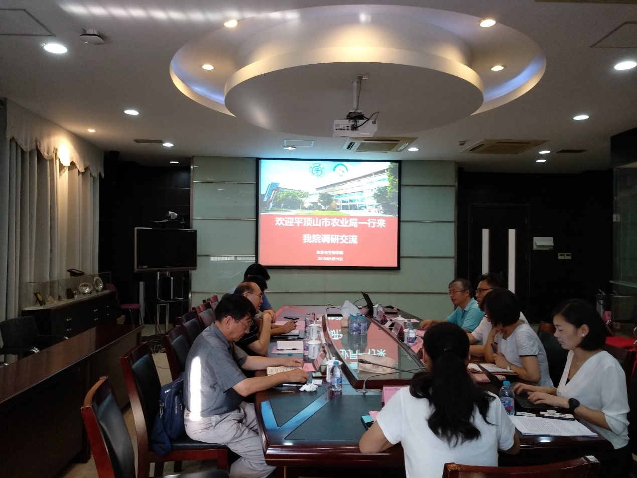 9月19日,平顶山市农业局局长杨四震一行来农业与生物学院调研交流,在农生大楼0-102召开座谈交流会,学院党委书记周培、食品系老师魏新林、焦顺山、岳进、学院党政办、新农村发展研究院相关老师参会,会议由周培主持。