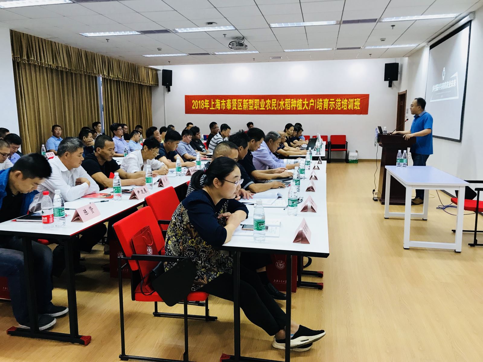 新型职业农民培育示范培训班主要针对水稻大户(科技示范户)、家庭农场经营者、农民合作社骨干等生产经营型职业农民。这次培训还承办上海市崇明区、金山区、青浦区等农委的新型职业农民培育示范培训班,合计培训人数超千人,分批次进行,今年11月底前完成。本期为第一期,学员累计培训15天,其中讲座与考察5天,于29日结束。另外10天为入户指导,根据各区农委的安排,一般在11月30日前结束。