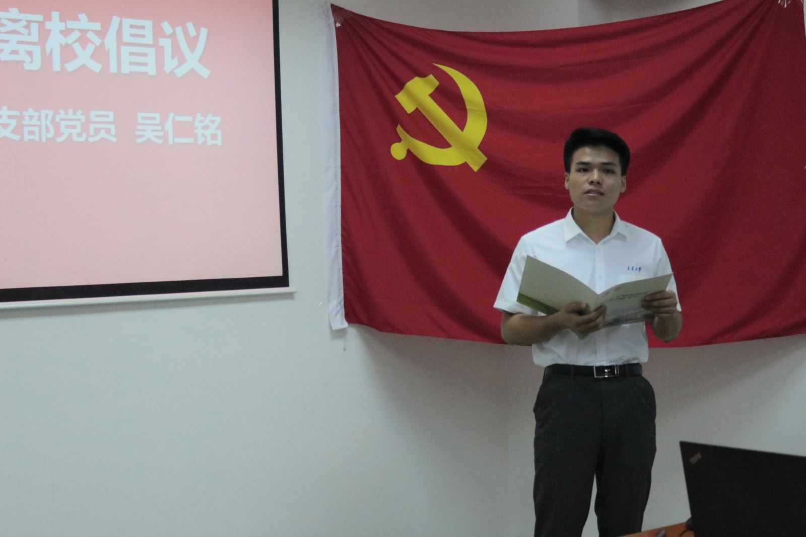 本科生党支部党员吴仁铭作文明离校倡议,号召同学们:谨记离校防疫,倡导文明离校;铭记导师之恩,珍视同窗之情;接力奉献爱心,贡献自我力量。
