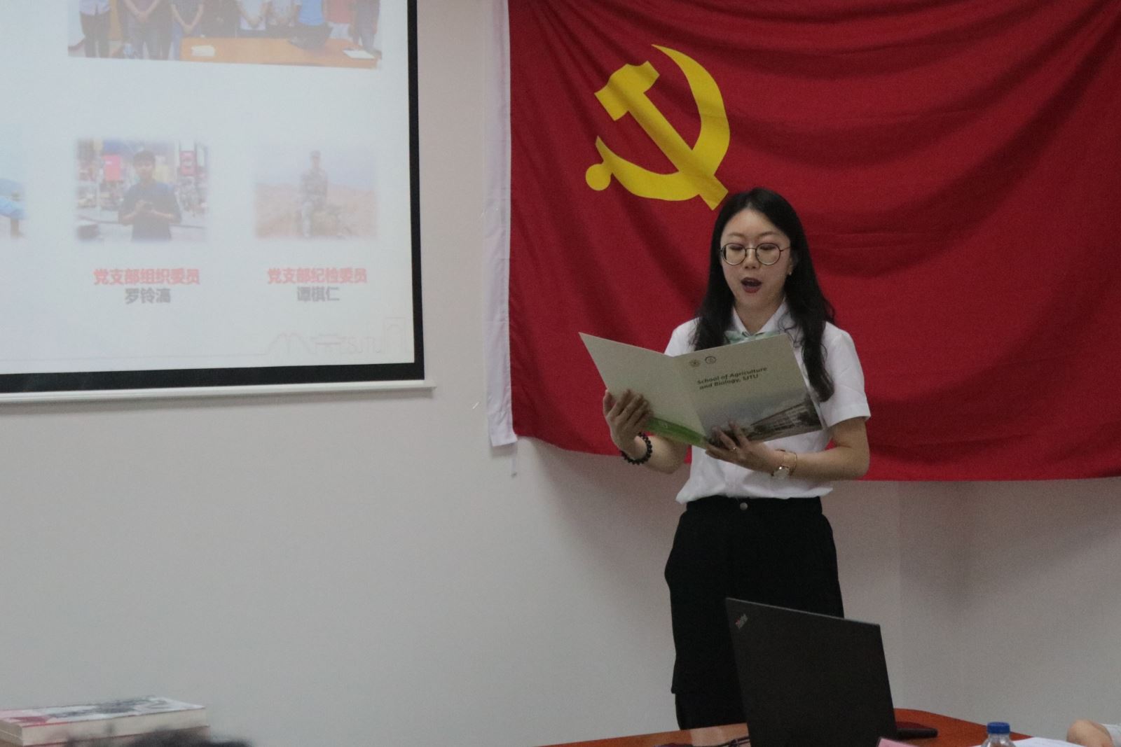 学生党支部是联系学生、宣传学生、组织学生和团结学生的桥梁与纽带。农业与生物学院本科生党支部书记黄丹阳向大会作支部工作汇报。她围绕着“规范党建事务,筑牢支部堡垒”“加强理论学习,落实党性提升”“深入实践服务,践行党员责任”“提高自我要求,发挥模范作用”等四方面,展现了支部如何发挥党支部的战斗堡垒作用和党员的先锋模范作用。