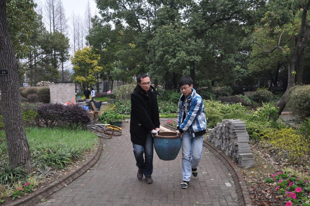 “低碳生活创意园”由农生学院园林系老师设计,研究生参与设计小品,项目由园林系老师带领本科生研究生和工人现场施工。师生与工人无畏风雨,现场一片繁忙的景象。