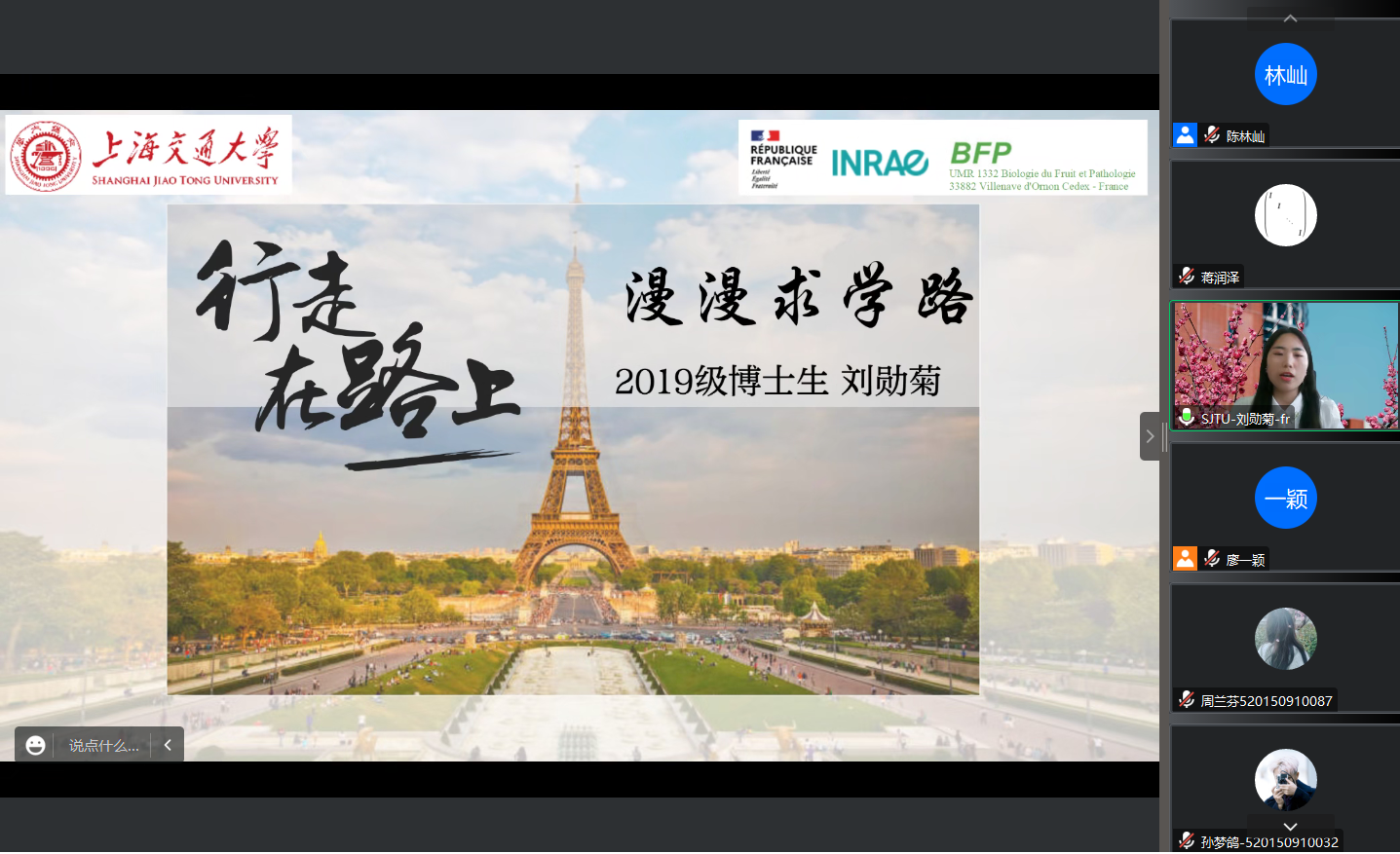 会议伊始,2019级博士生刘勋菊进行出国交流经验分享,她结合自身情况和当前政策,为同学们介绍了现有的出国留学途径、信息来源以及相关申请要求。随后,刘勋菊描述起在法国的浪漫求学路,向同学们展示了自身的留学生活和学习科研,鼓舞了有出国想法的同学们的信心。