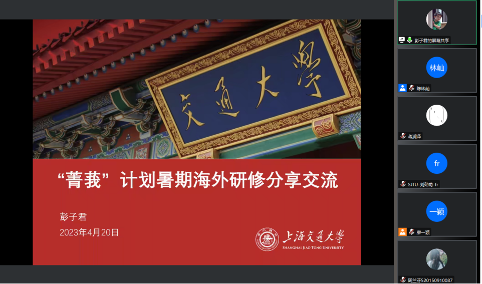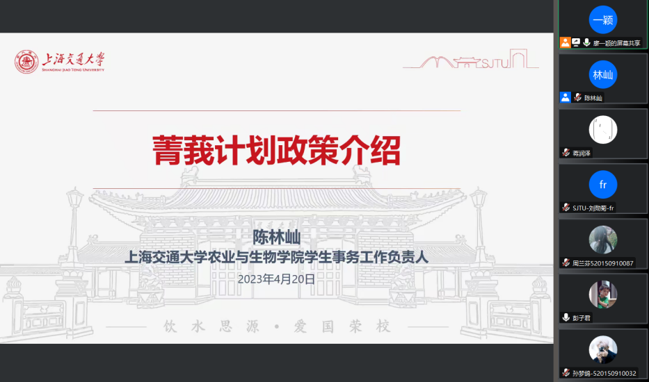为帮助农生学子开阔国际化视野,提前做好留学规划,4月20日晚,农业与生物学院菁莪计划介绍及出国交流的经验分享会于线上顺利召开。学院思政教师李明、吕俊瑶、陈林屾以及部分本科生参加此次分享会,会议由辅导员廖一颖主持。