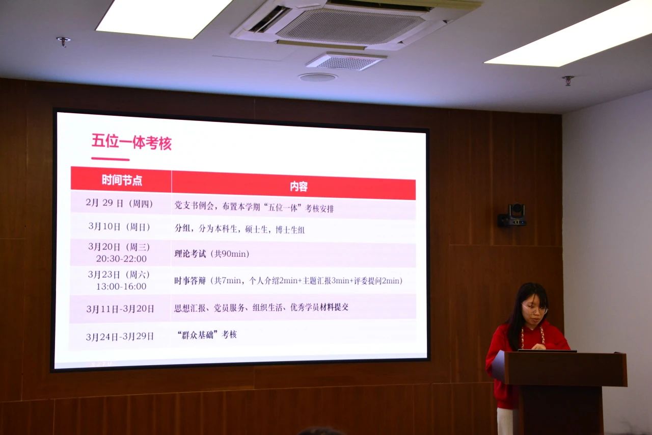 罗渝宵针对新学期发展党员工作方案展开说明。她强调,各位支书在发展党员工作中,应提高政治站位,理顺工作逻辑,更好地选拔培养党支部新鲜力量。刘旺旺针对毕业生党组织关系转接方案进行讲解,并鼓励各位支书切实提高组织力,用情、用心、用力做好党建工作。