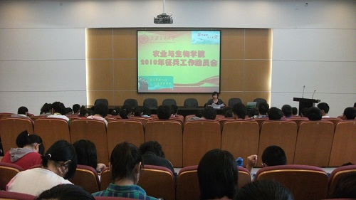 为了贯彻学校10月18日征兵工作会议精神,将2010年冬季征兵工作落到实处,农学学院于10与20日下午在农生大楼报告厅召开了“2010年冬季农业与生物学院征兵工作动员会”。院党委副书记、学工办主任谢立平老师出席会议并做动员。2007级和2010级两百余名学生及学工办全体思政教师参加了本次动员会。