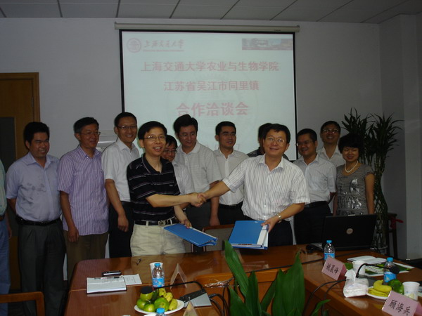 9月17日上午,农业与生物学院与吴江市同里镇人民政府合作协议签约仪式在农生大楼0-103会议室举行。吴江市同里镇党委书记陈建忠、党委副书记徐火根、副镇长肖明华一行8人与农业与生物学院党委副书记曹林奎,院长助理车生泉、赵大云以及学院有关部门负责人就院地合作事宜进行了友好而深入的交谈。并由曹林奎副书记与陈建忠书记分别代表院地双方签署了合作协议。仪式由车生泉教授主持。