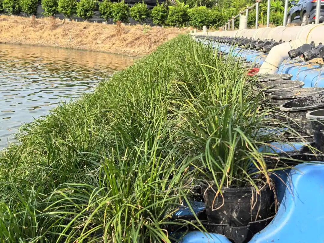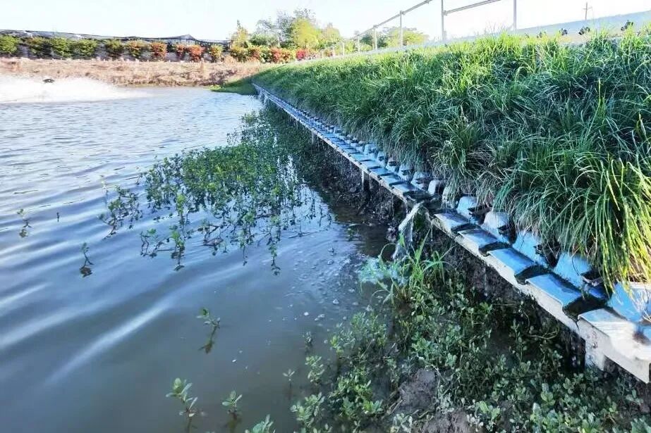 在广东省佛山市某水产养殖基地,鱼塘里养殖的是“优鲈3号”加州鲈鱼,密度达到了每亩8000尾,鱼儿在水里尽情跃动,放眼望去,一侧塘坡上整齐排列着蓝色的绿植模块,基地负责人欣喜地说:“自从引进可控微湿地系统,鱼塘里的水质变好了,整个养殖阶段不排放尾水,药剂投放量也减少了,鱼的摄食量增加,产量提高,鱼的肉质也更加鲜美,还不占用养殖面积。”