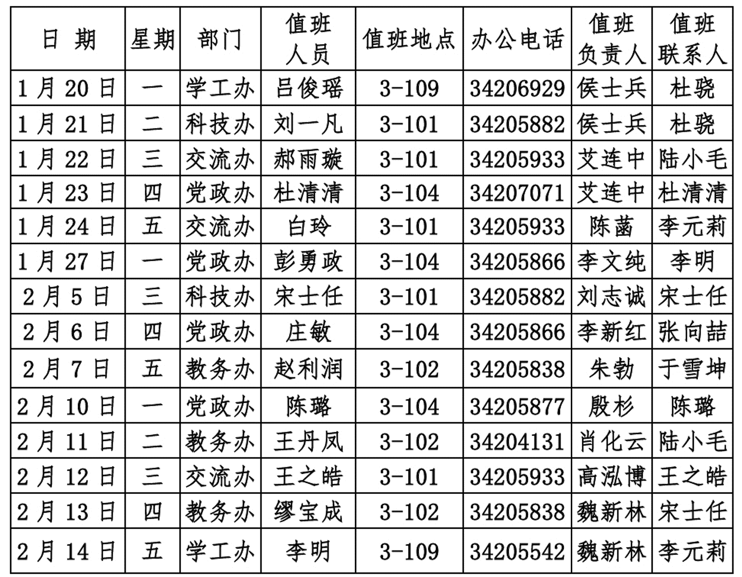 3. 值班人员职责:负责学院日常事务处理,加强安全巡查,做好上级临时交办的任务。