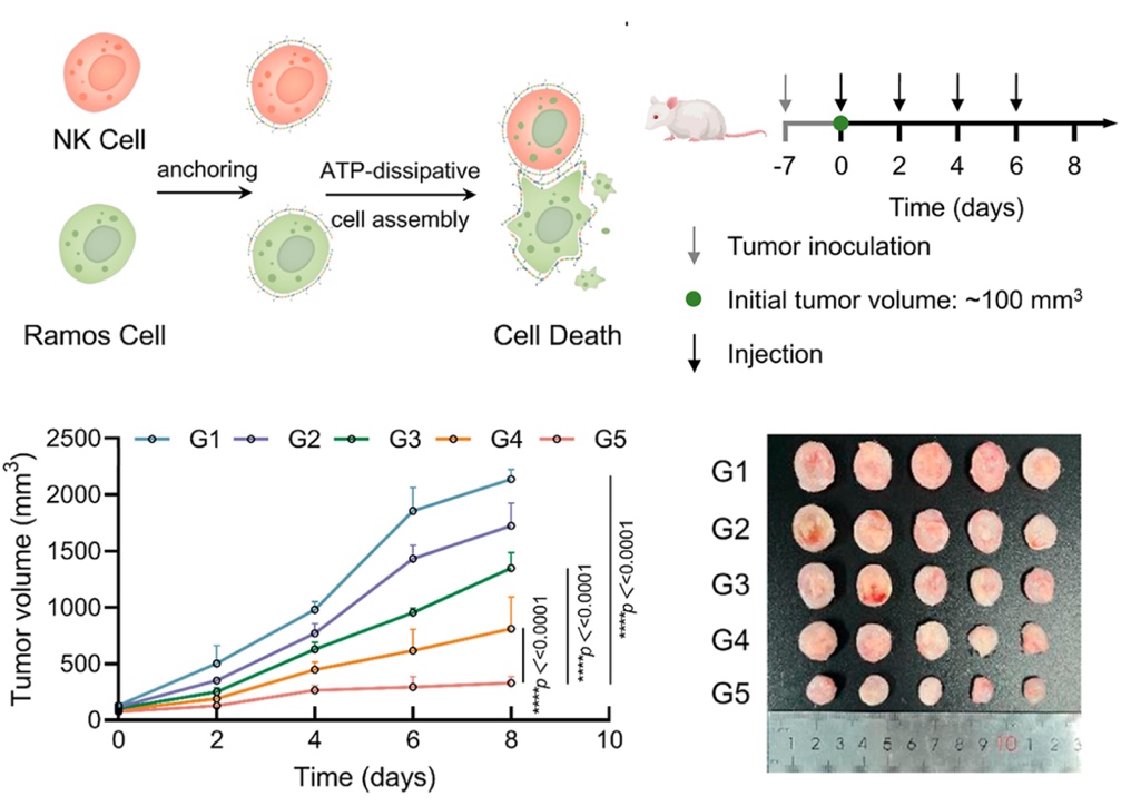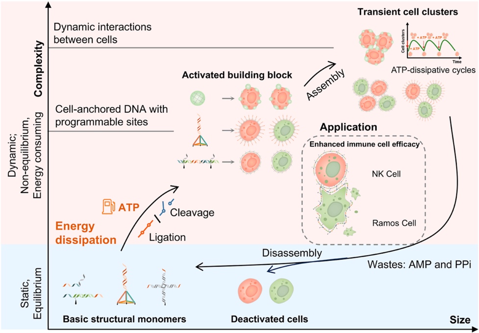 这项研究通过将框架核酸技术与非平衡自组装机制相结合,构建了一个可在能量调控下实现细胞间可逆组装与解离的动态体系。该体系能够在时空尺度上精准调控细胞间的相互作用,模拟了生命体系中能量耗散驱动的动态行为。更重要的是,该平台在肿瘤免疫治疗中展现出显著优势,显著增强了NK细胞与肿瘤细胞的结合与杀伤效率。该研究为构建能量驱动型人工生命系统与细胞免疫治疗平台提供了新的策略方法。