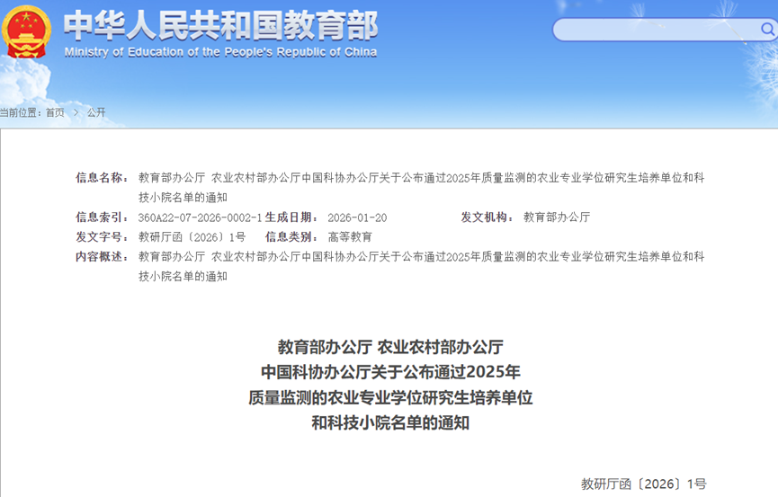 近日,教育部办公厅、农业农村部办公厅、中国科协办公厅联合发布了《关于公布通过2025年质量监测的农业专业学位研究生培养单位和科技小院名单的通知》。我院魏新林特聘教授负责的“上海金山茶叶科技小院”顺利通过监测。这标志着我院在深化产教融合、服务国家乡村振兴战略方面,获得一项重要的国家级认可。